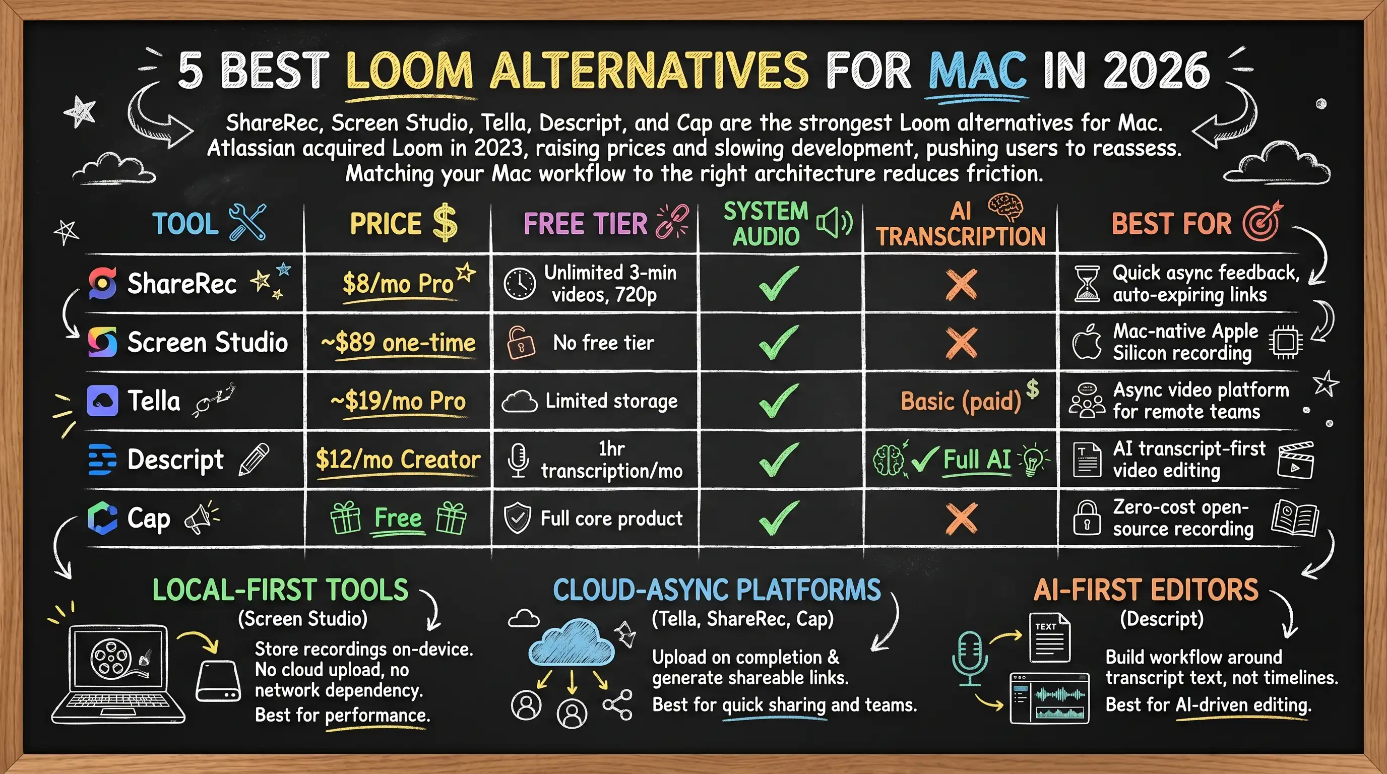 ShareRec, Screen Studio, Tella, Descript, and Cap are the five strongest Loom alternatives for Mac in 2026. Atlassian acquired Loom in 2023 and has since raised prices and slowed feature development, pushing Mac users to reassess their screen recording setup. ShareRec ($8/mo Pro) wins for instant async recordings with auto-expiring links. Screen Studio (~$89 one-time) is the only Mac-native Apple Silicon-optimized option in this group. Tella is the closest structural replacement for Loom's async video platform and team workspace. Descript (~$12/mo) leads on AI transcription with a transcript-first editing workflow. Cap is the only fully free, open-source option with no watermarks and no subscription.