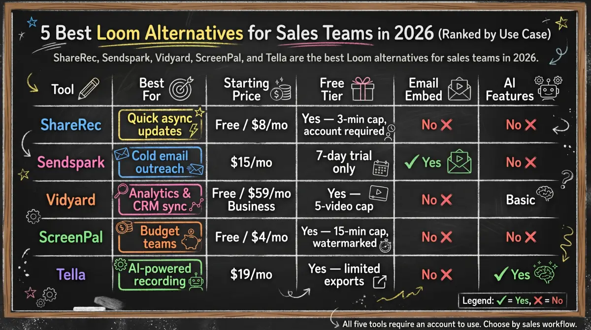 ShareRec ($8/mo), Sendspark ($15/mo), Vidyard ($59/mo Business), ScreenPal (free–$4/mo), and Tella ($19/mo) are the five best Loom alternatives for sales teams in 2026 — each built for a distinct sales workflow.