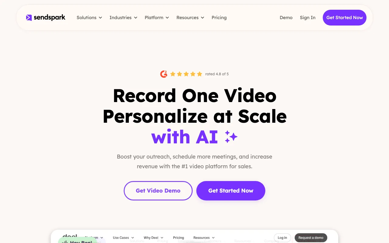 Sendspark starts at $15/month and renders an animated video thumbnail inside the Gmail or Outlook email body — prospects see the video preview before clicking any link. Best for: outbound SDRs embedding personalized video thumbnails in Gmail, Outlook, or sales engagement platforms like Outreach and Salesloft.
