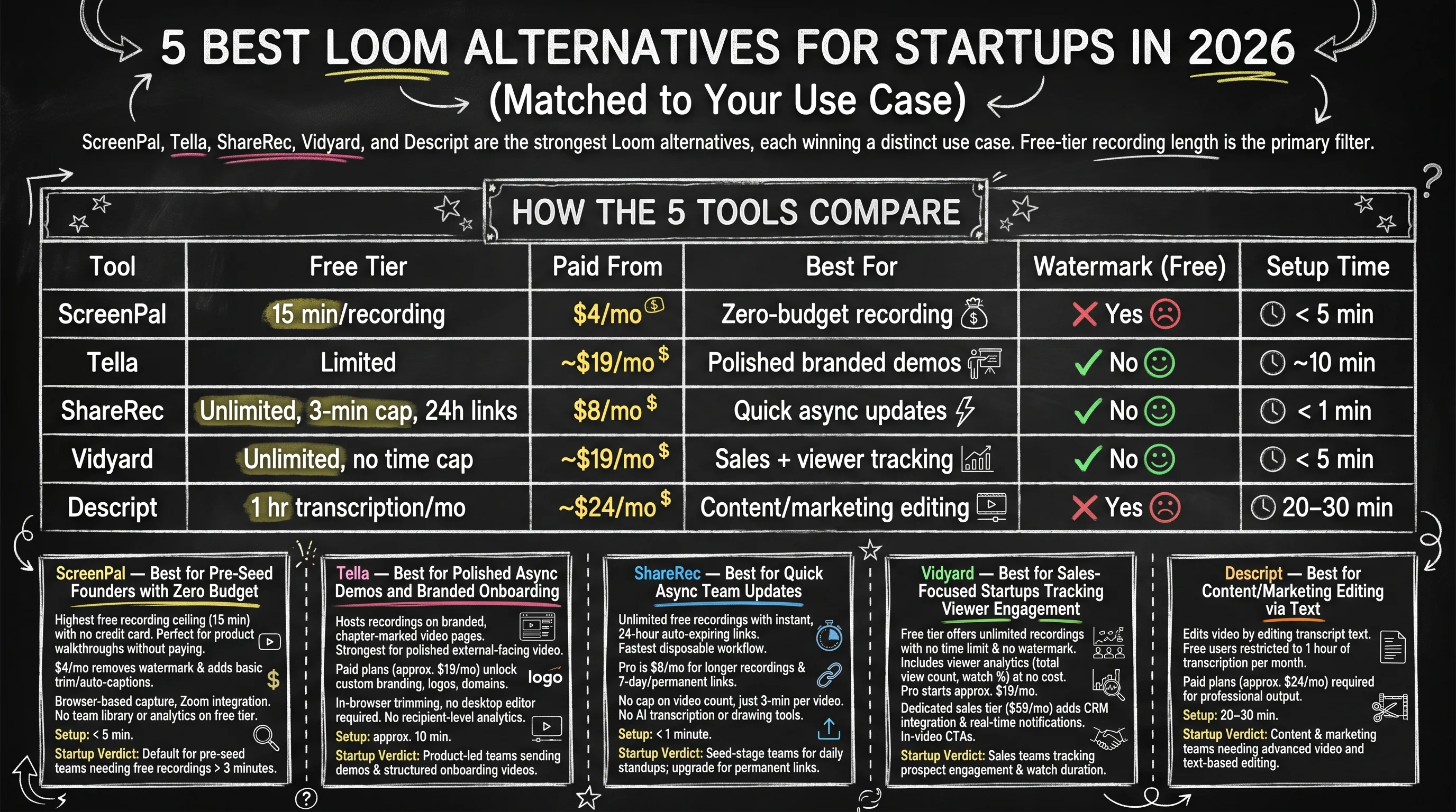 ShareRec is the top overall recommendation for startup teams in 2026 — unlimited free recordings with instant auto-expiring links and the fastest setup of any tool here; ScreenPal, Tella, Vidyard, and Descript are the stronger picks for specific use cases. ShareRec gives unlimited free recordings with a 3-minute cap per video and 24-hour auto-expiring links; Pro is $8/mo. ScreenPal records up to 15 minutes for free with no credit card — the highest free recording ceiling in this comparison. Tella (~$19/mo) produces chapter-marked, branded async video pages for investor demos and user onboarding. Vidyard's free tier has no recording time limit, no watermark, and includes basic viewer analytics. Descript ($24/mo) edits video by editing transcript text — delete a word from the script and that clip is cut from the video.