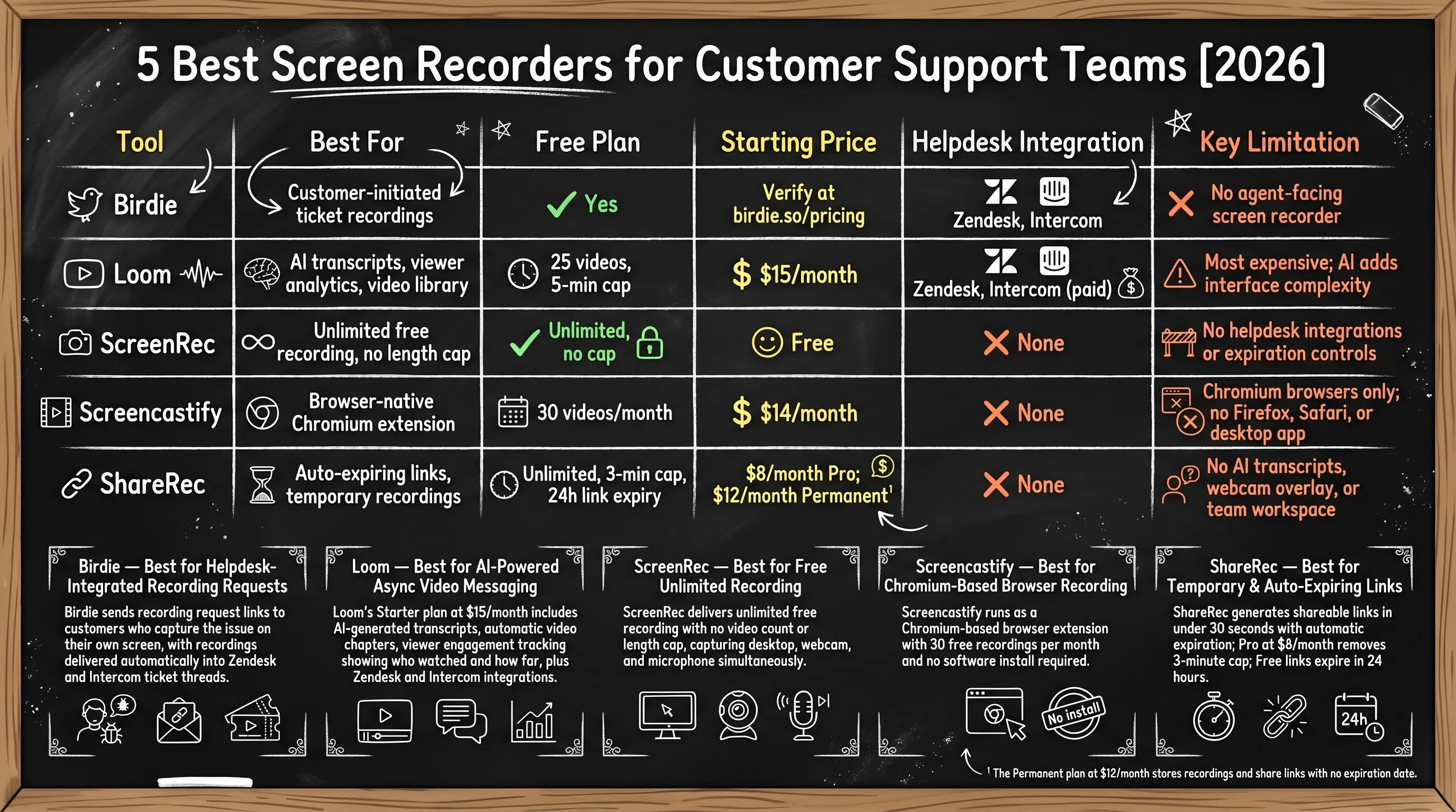 Birdie, Loom, ScreenRec, Screencastify, and ShareRec are the five strongest screen recorders for customer support teams in 2026, each serving a distinct workflow. Birdie is the only tool that lets agents send recording request links to customers — customers capture the bug on their own screen and the video lands directly in the ticket. Loom provides AI-generated transcripts, viewer engagement analytics, and a searchable video library; free accounts cap at 25 videos and 5 minutes each, with paid plans starting at $15/month. ScreenRec delivers unlimited free recording with no video count or length cap, capturing desktop, webcam, and microphone simultaneously. Screencastify runs as a Chromium-based browser extension with 30 free recordings per month and no software install required. ShareRec generates shareable links in under 30 seconds with automatic expiration — Pro at $8/month removes the 3-minute cap; free links expire in 24 hours with automatic deletion, and a Permanent plan at $12/month stores links indefinitely. For helpdesk-integrated workflows, Birdie or Loom; for zero-budget unlimited recording, ScreenRec; for Chrome or Edge environments, Screencastify; for temporary async recordings that shouldn't live in a library, ShareRec.