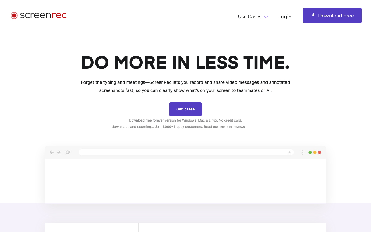 ScreenRec's free plan includes unlimited recordings with no length cap and no video count limit, capturing desktop, webcam, and microphone simultaneously — the only tool in this comparison with no paywall on recording volume. Best for: individual agents or small support teams who need unlimited recording without hitting a free-tier ceiling.